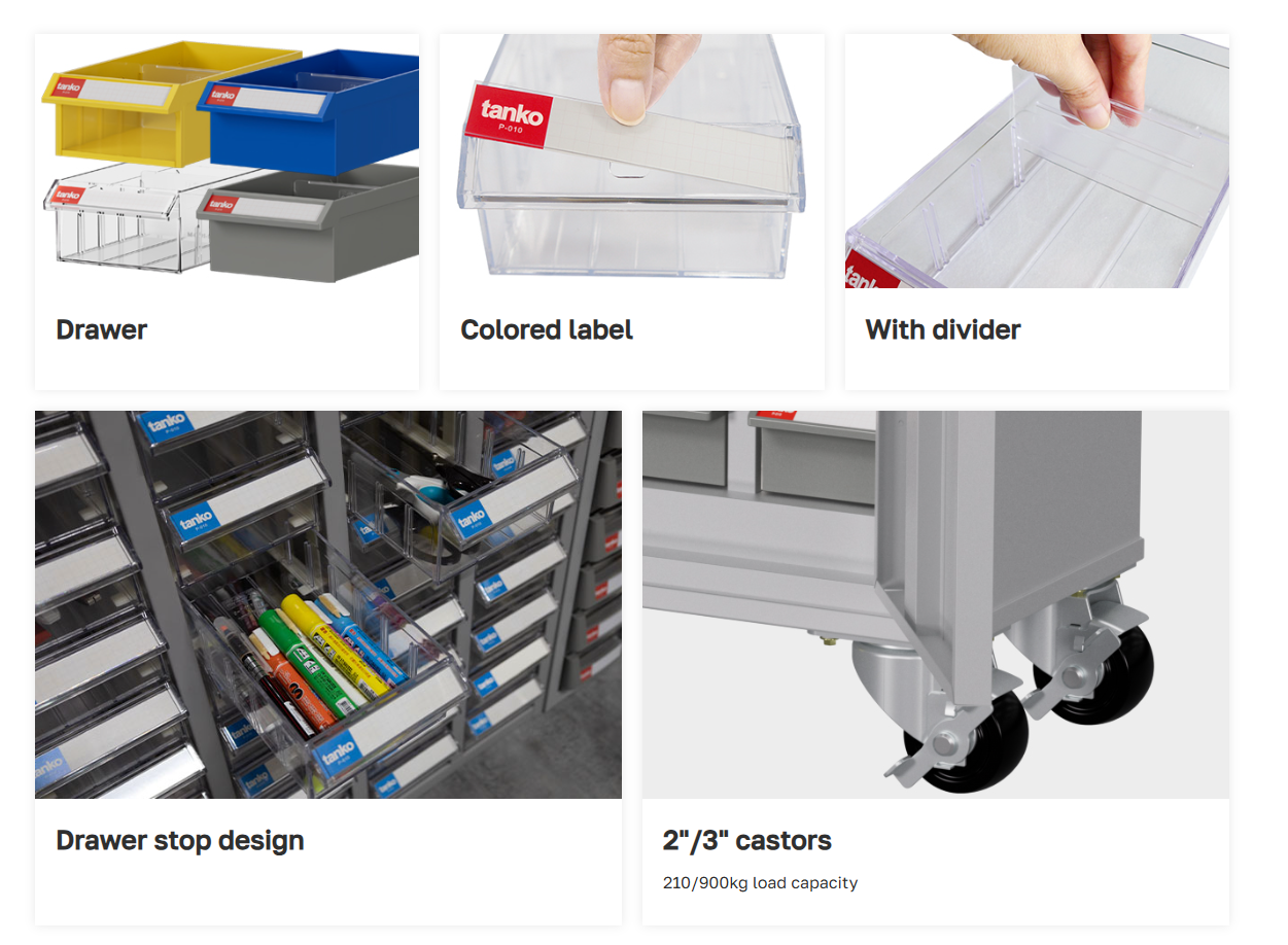 มี ฉลากสำหรับเขียนป้ายกำกับ (Label each drawer) เพื่อแยกหมวดหมู่ของอุปกรณ์แต่ละช่อง
