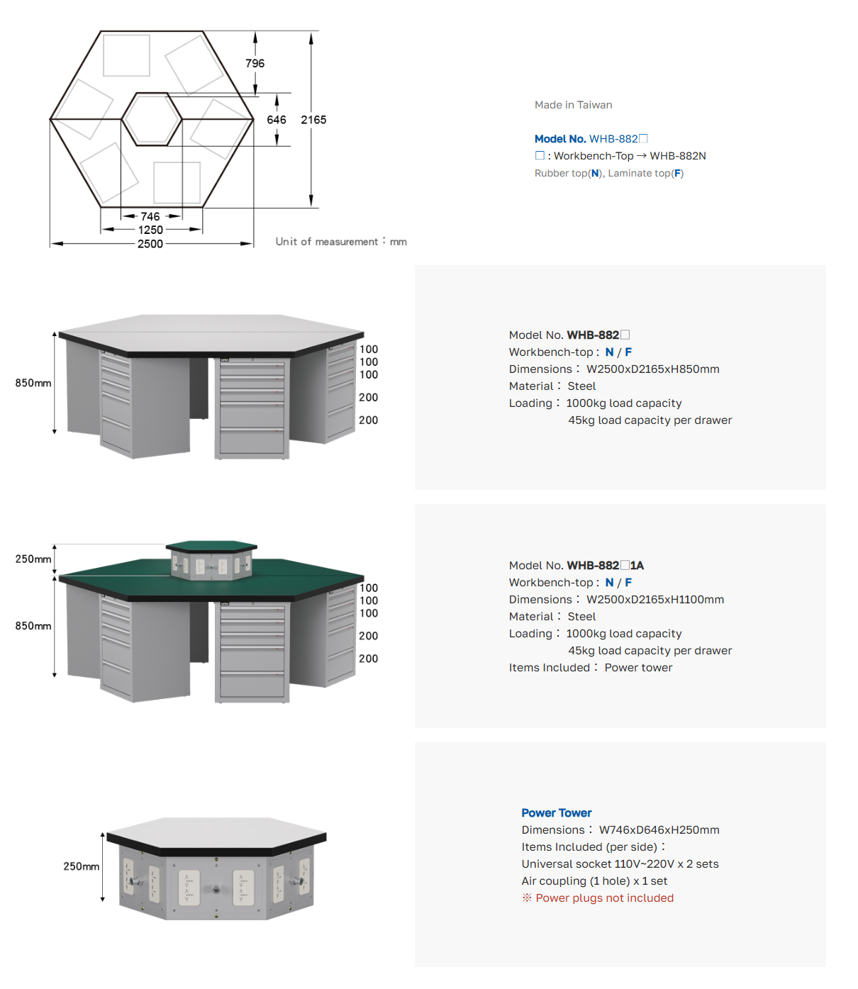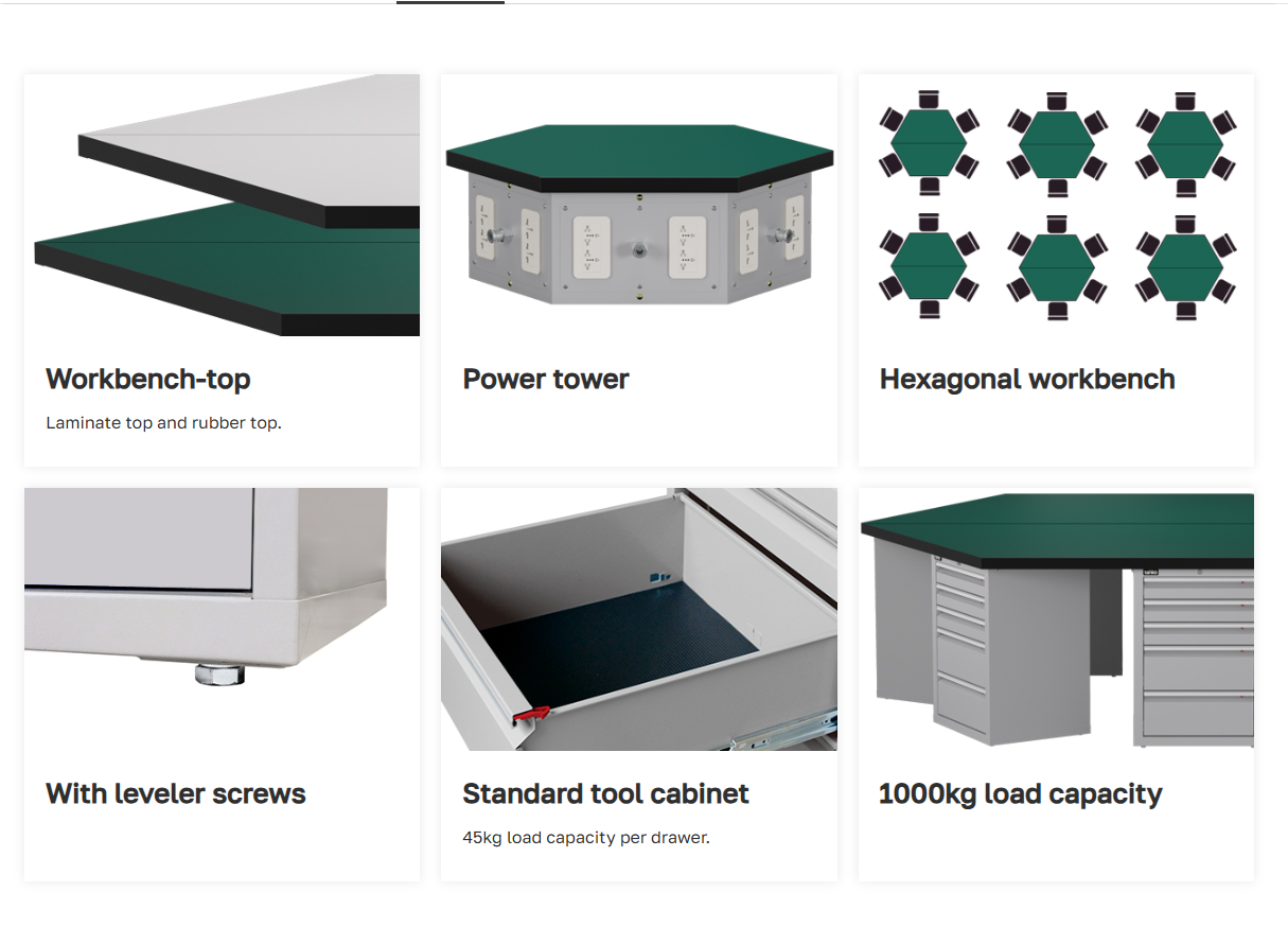 ชื่อสินค้า : โต๊ะช่างหกเหลี่ยมหน้าท็อปลามิเนตพร้อมตู้เหล็กลิ้นชักและช่องปลั๊กไฟ