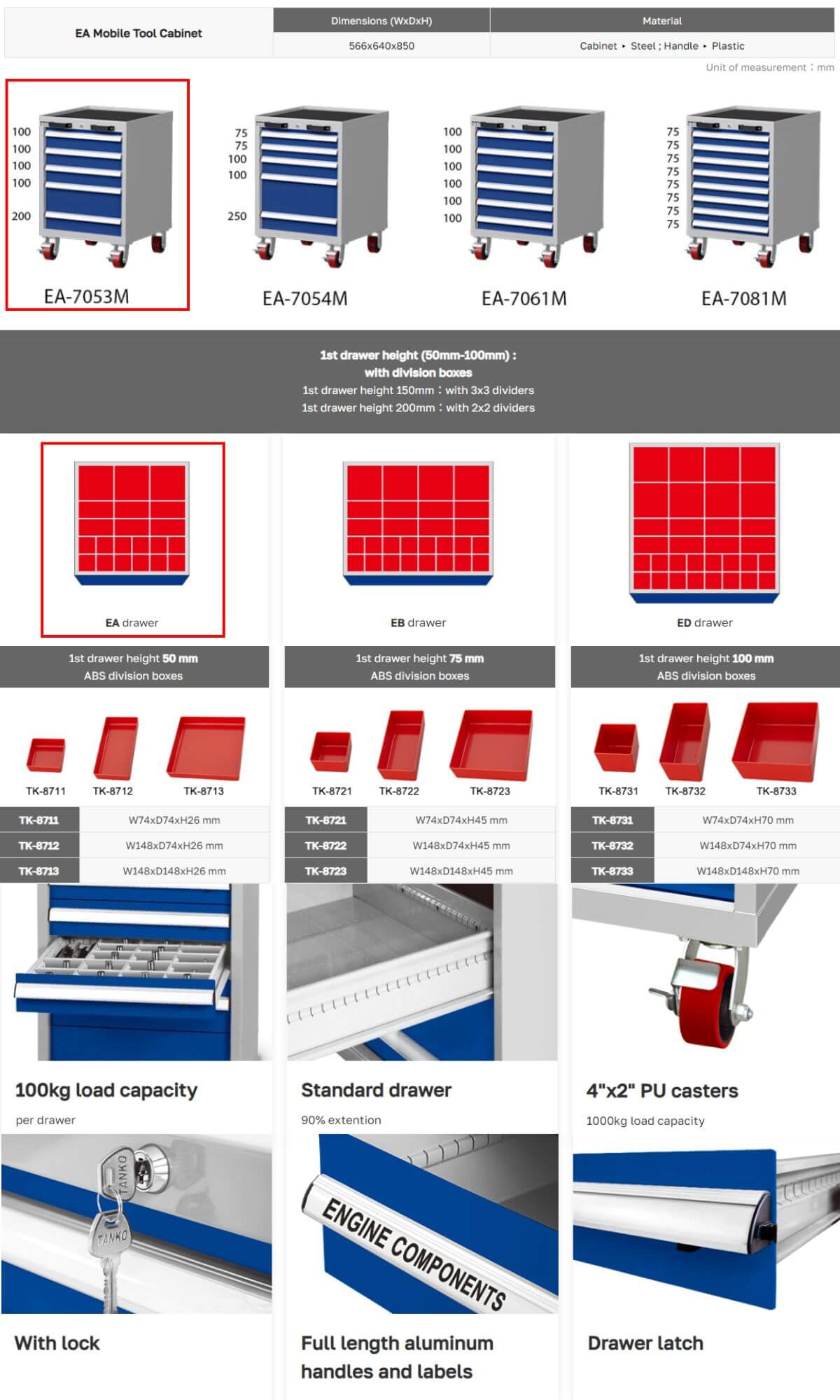 มี 5 ลิ้นชัก (ดึงลิ้นชักได้ 90%) รับน้ำหนัก 100 kgs /ลิ้นชัก