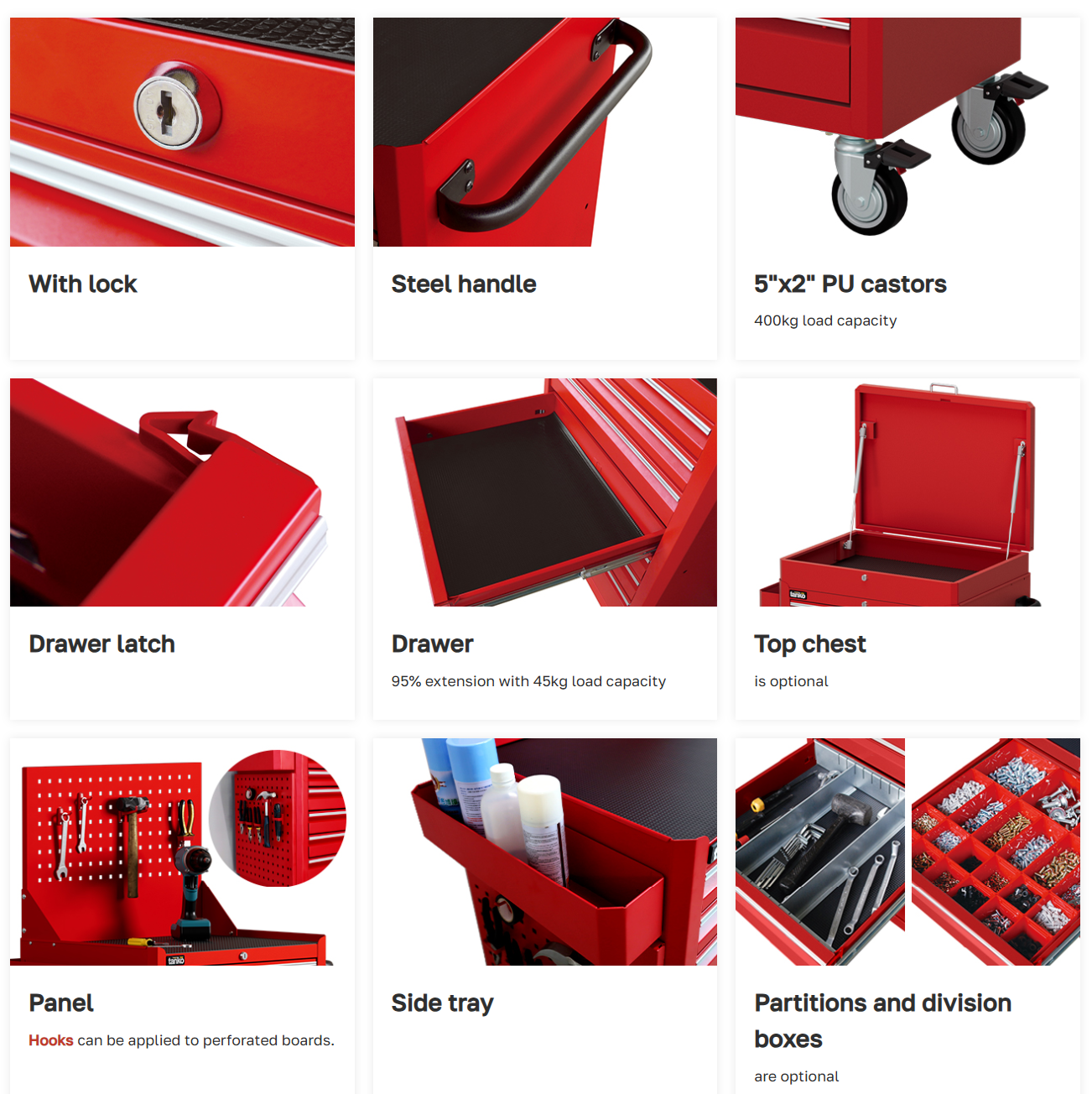 ลิ้นชักบนสุดมาพร้อมกล่องพลาสติกจัดใส่อุปกรณ์ ส่วนลิ้นชักอื่น มีแผ่นเหล็ก สามารถจัดแบ่งช่องภายในลิ้นชักได้ตามความต้องการ