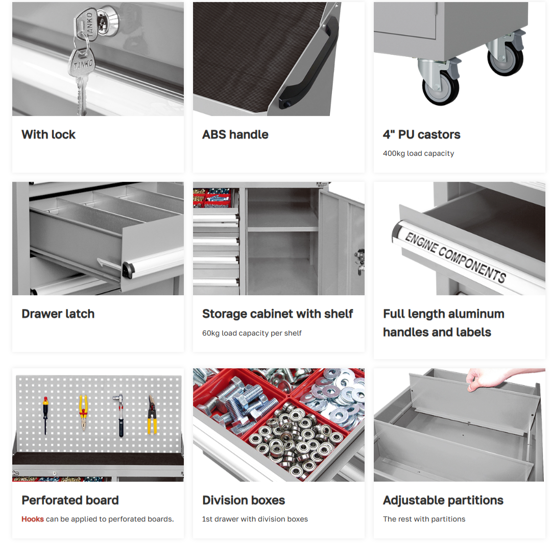 ลิ้นชักบนสุดมาพร้อมกล่องพลาสติกจัดใส่อุปกรณ์ ส่วนลิ้นชักอื่น มีแผ่นเหล็ก สามารถจัดแบ่งช่องภายในลิ้นชักได้ตามความต้องการ