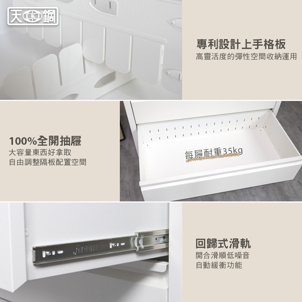 วัสดุของลิ้นชัก : เหล็ก (กระบวนการผลิตเกิดขึ้นจากหุ่นยนต์อิเลกทรอนิคส์ 100%) สามารถรับน้ำหนักได้ 35 กิโลกรัม/ชั้น
