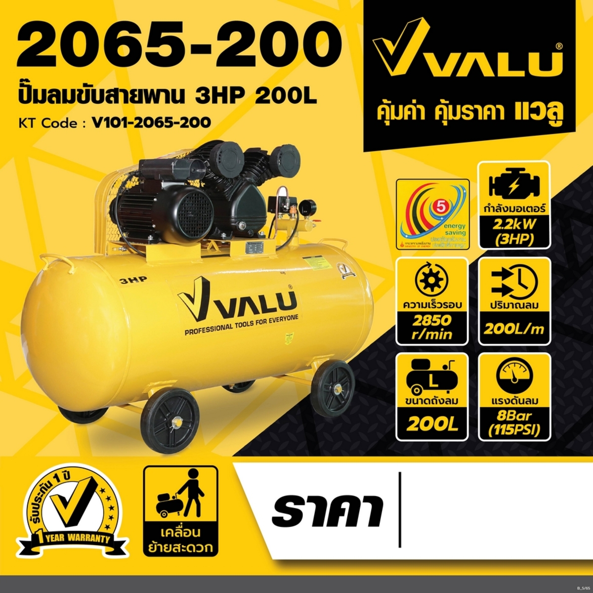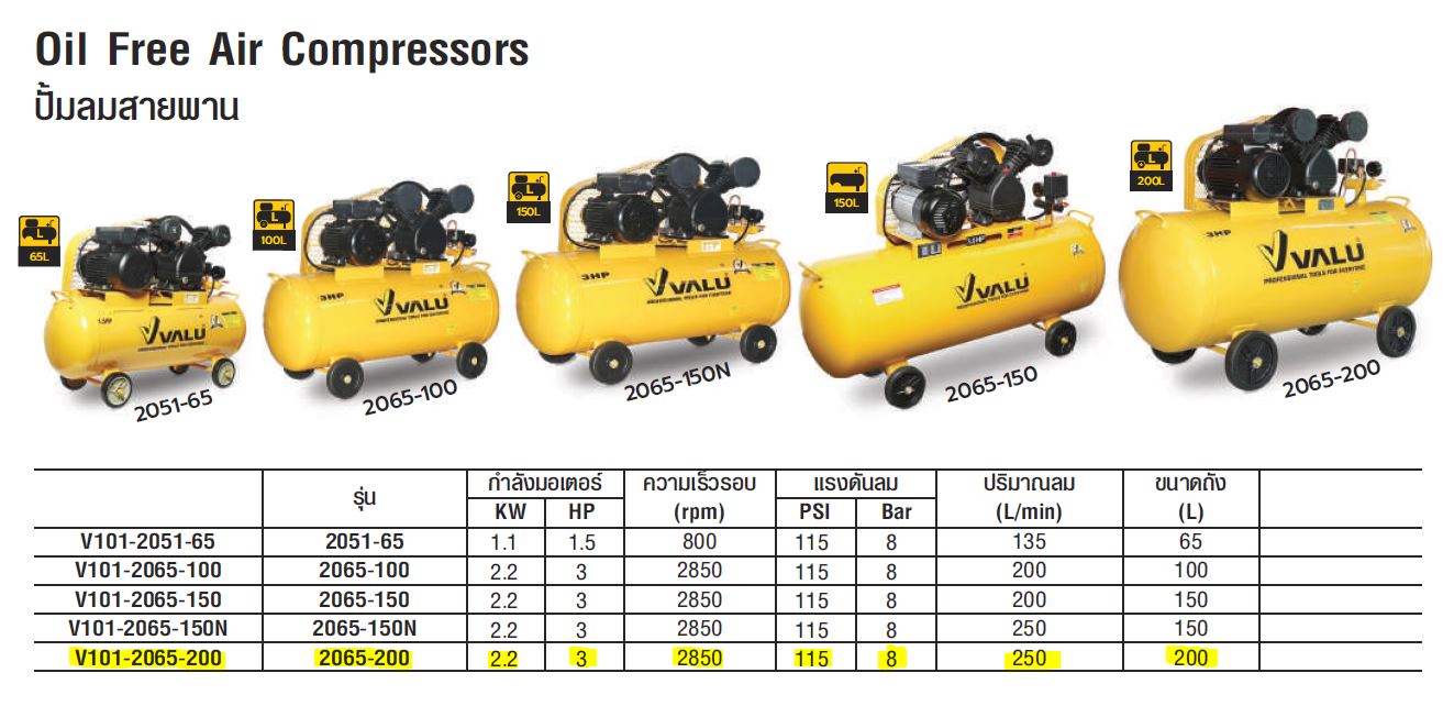 ปั๊มลมสายพาน 3 แรงม้า 2,237 วัตต์ แบรนด์ VALU รุ่น KT_V101-2065-200