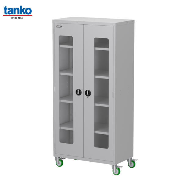 ชื่อสินค้า : ตู้เหล็กเก็บเครื่องมือช่างติดล้อ 4 ชั้นวาง ประตูบานใส