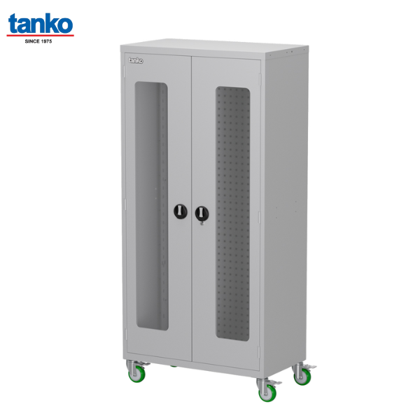 ชื่อสินค้า : ตู้เหล็กเก็บเครื่องมือช่างติดล้อ พร้อมรูแผงแขวนเครื่องมือ ประตูบานใส