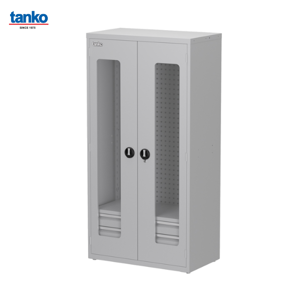 ชื่อสินค้า : ตู้เหล็กเก็บเครื่องมือช่างติดลิ้นชัก พร้อมรูแผงแขวนเครื่องมือ ประตูบานใส