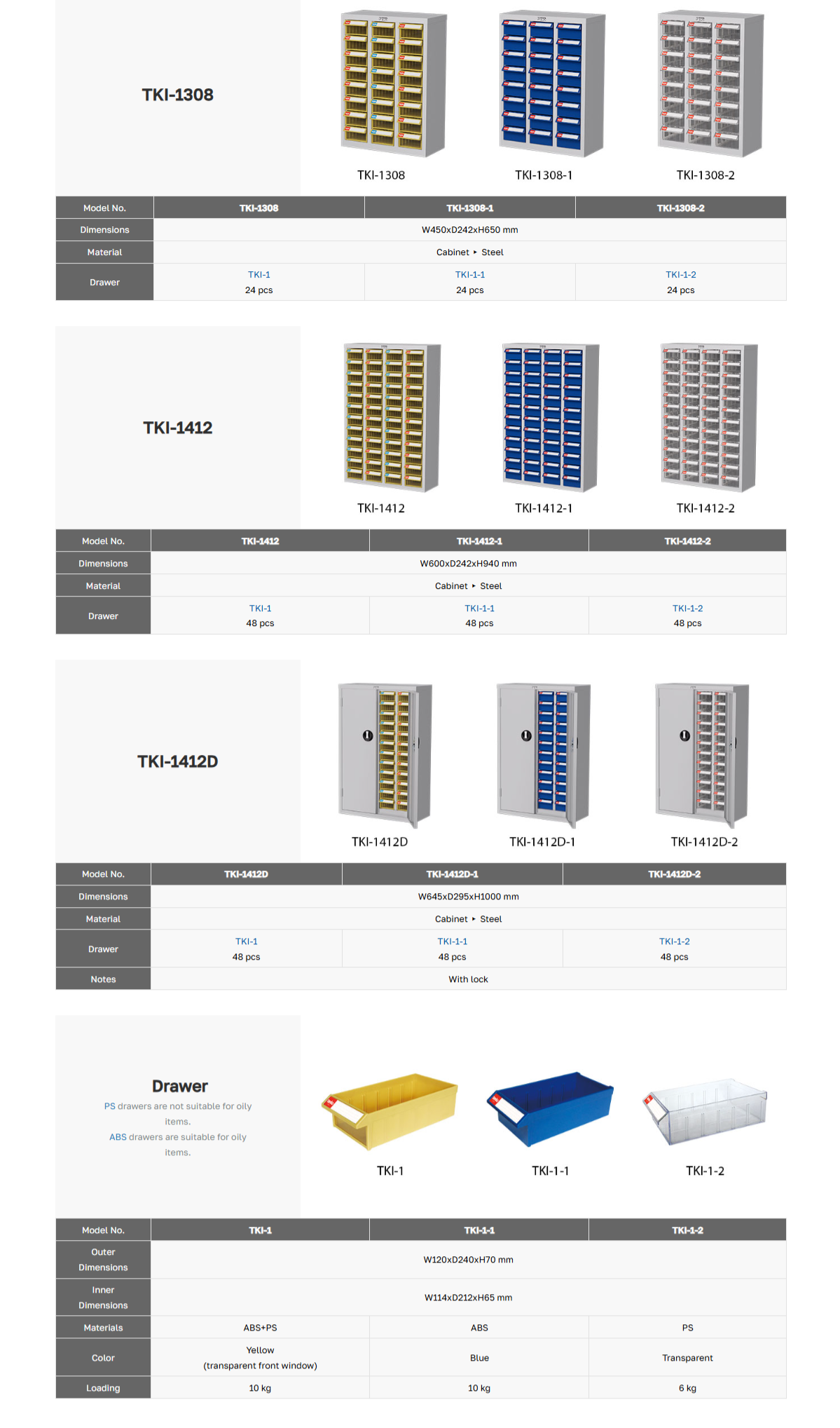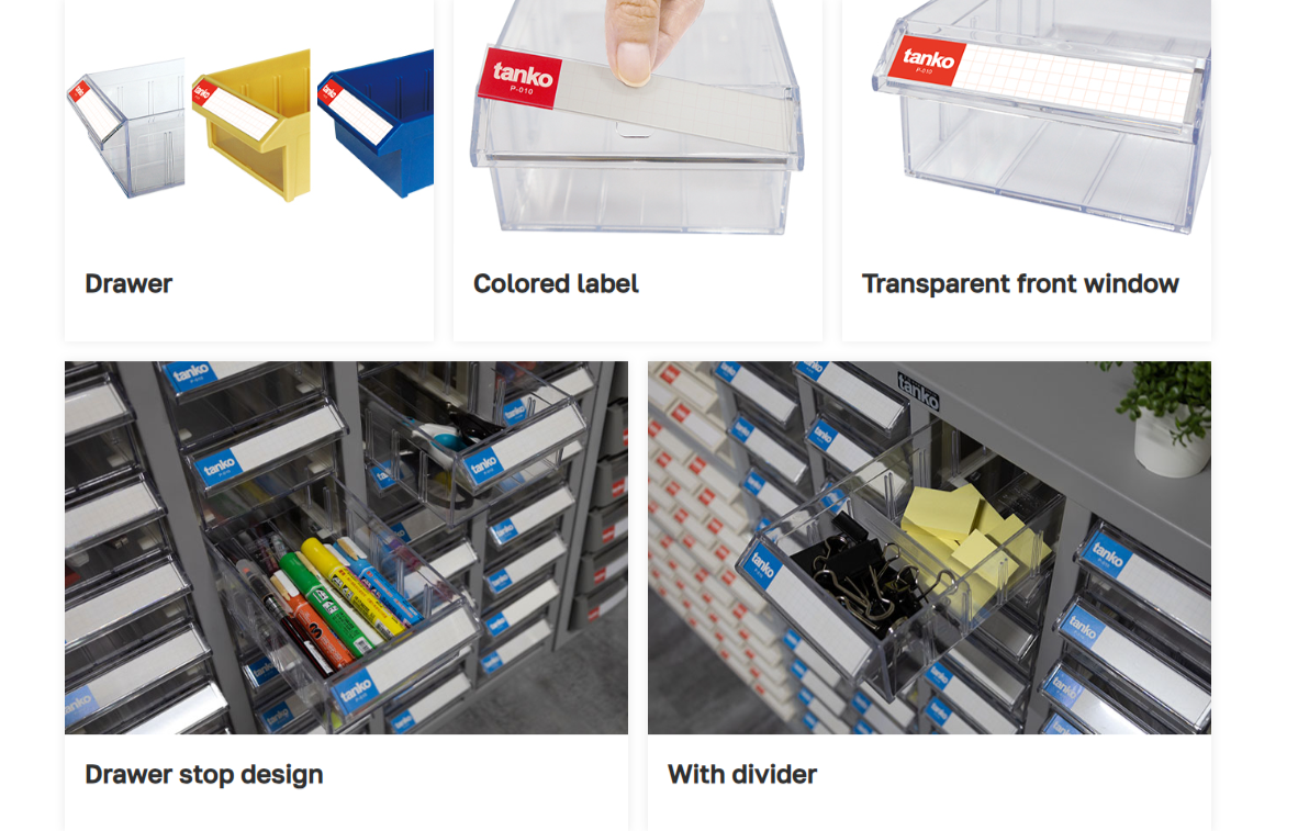 ลิ้นชักทำจากพลาสติก PS แต่ละช่องมีแผ่นพลาสติกใสสำหรับแบ่งช่องภายใน (Divider) เพื่อความเป็นระเบียบ