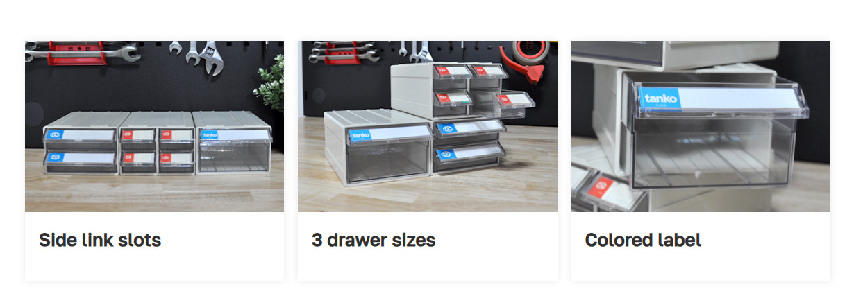 3 Drawer Sizes มีให้เลือก 3 ขนาดของลิ้นชัก เพื่อการจัดเก็บอุปกรณ์หลากหลายรูปแบบ