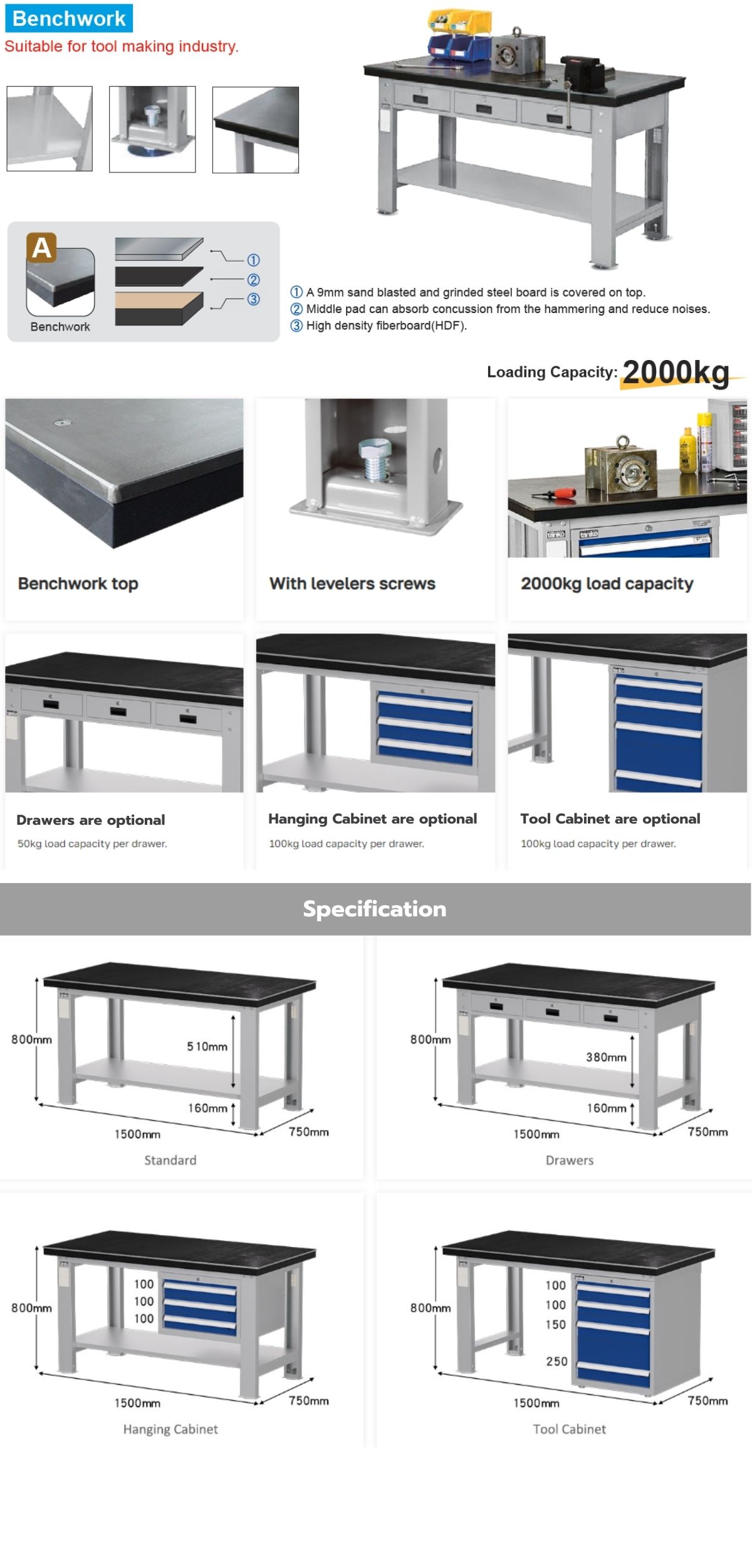 ขนาดโต๊ะทำงานช่าง : W1500 x D750 x H800 mm.