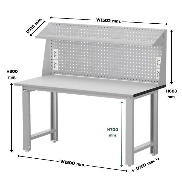 - ชื่อสินค้า : โต๊ะทำงานช่าง หน้าท็อปลามิเนต พร้อมแผงแขวนเครื่องมือ ชั้นวาง และปลั๊กไฟ