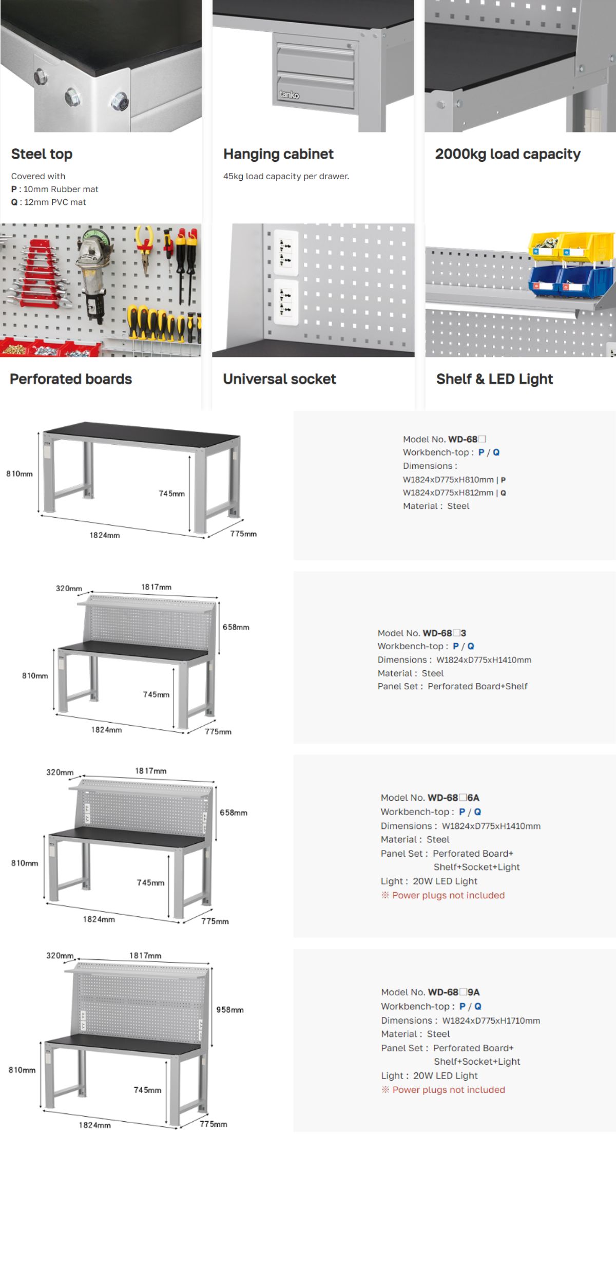 หน้าท๊อป : เหล็ก (Steel top) ผลิตจากแผ่นหล็ก ความหนา 2 mm. + แผ่นยาง (Rubber Mat) ปูด้านบน ความหนา 10 mm.