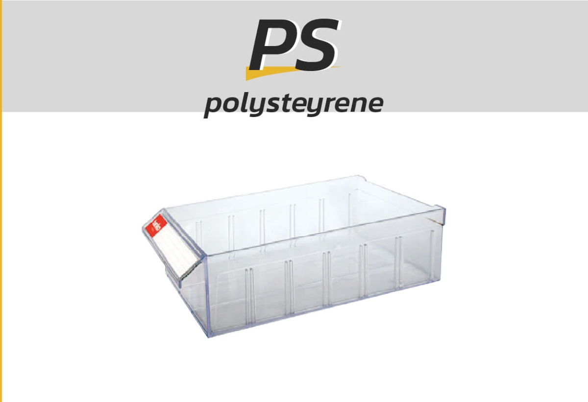 PS (Polystyrene) เป็นพลาสติกใส แข็ง แต่ค่อนข้างเปราะและแตกหักง่าย มีน้ำหนักเบา จุดเด่นคือความใส โปร่งแสง ทำให้มองเห็นชิ้นส่วนภายในได้ชัดเจน โดยไม่ต้องเปิดกล่อง นอกจากนี้ยังรีไซเคิลได้เพื่อนำไปผลิตเป็นไม้แขวนเสื้อ ไม้บรรทัด หรือถาดใส่ไข่